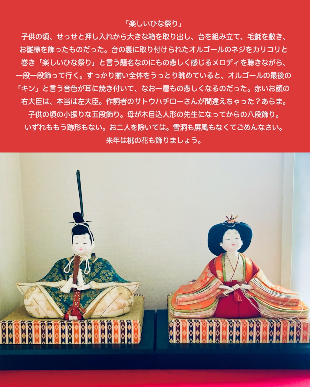 子供の頃、せっせと押し入れから大きな箱を取り出し、台を組み立て、毛氈を敷き、 お雛様を飾ったものだった。